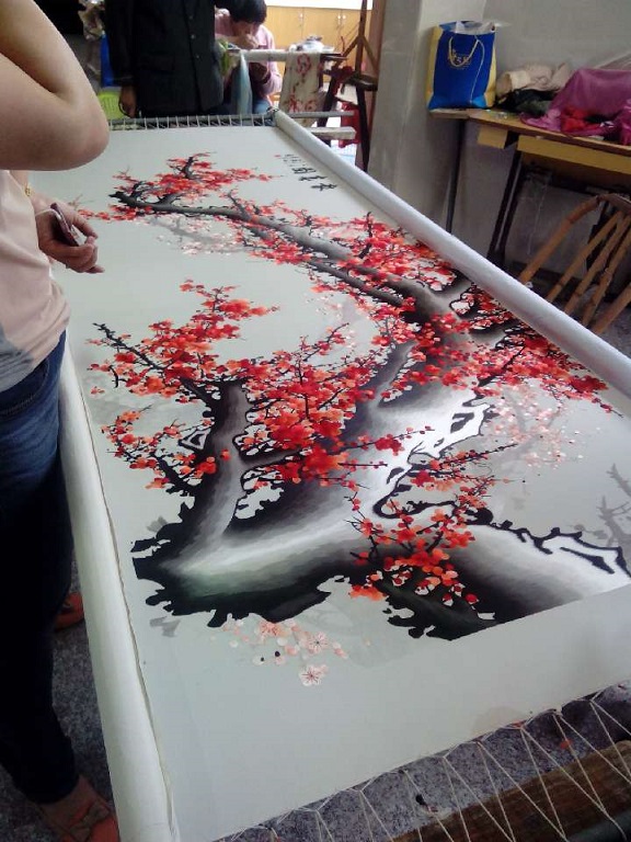 蘇州刺繡以其精細、傳神、精致著稱,近年來蘇繡也成為了裝飾類的新寵,不少蘇繡工藝品開始進駐家裝、酒店、高級會所的市場,掀起了一股手工蘇繡熱,今年1月份湖北省人民政府工作人員來到蘇州嬌古蘇繡,在湖北省的洪山禮堂需要做一件手工蘇繡,嬌古蘇繡的領導非常重視,經(jīng)過政府領導的研究決定,選用梅花報春圖為題材做一副傳統(tǒng)的蘇繡屏風。