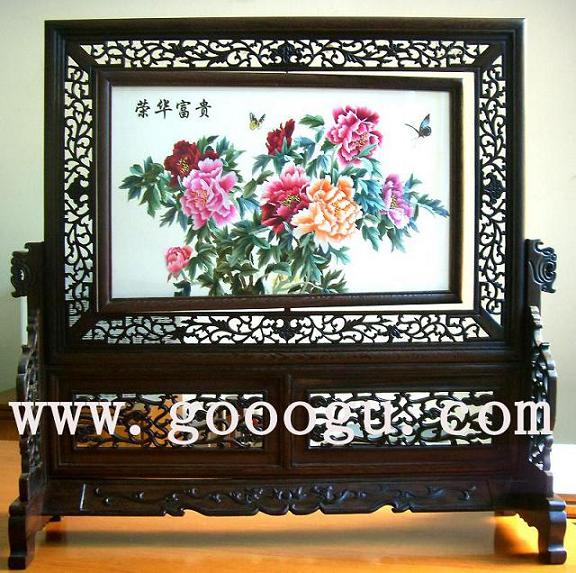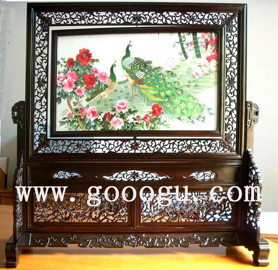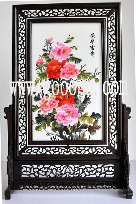 鳳穿牡丹雙面繡臺屏|檀木雕花架刺繡屏風|刺繡工藝品