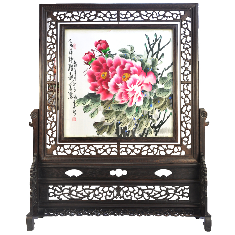 寫意牡丹擺件雙面繡雞翅木框架古典工藝品蘇州刺繡