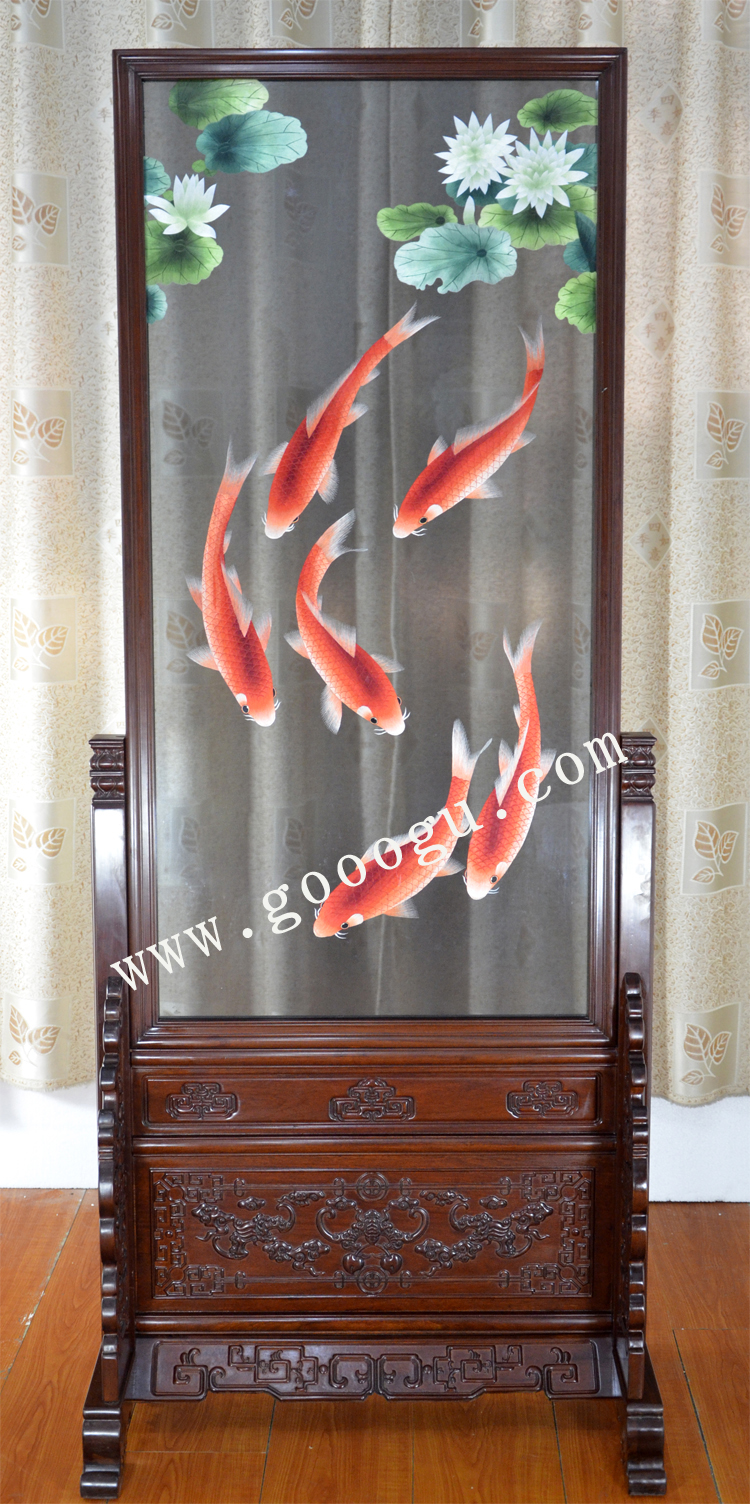 蘇繡玄關(guān)屏風 蓮花魚 紅木框架 純手工