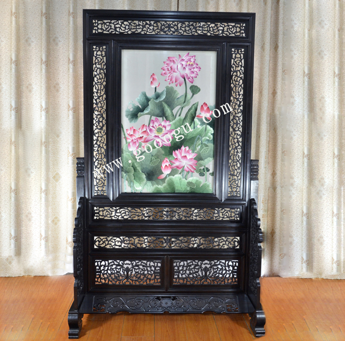 蘇繡玄關(guān)屏風(fēng) 精品荷花 手工刺繡 紫檀架